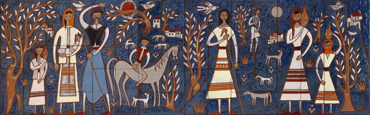Στο κεραμικό πανό του Πάνου Βαλσαμάκη, ο θεματικός άξονας της ελληνικότητας προσεγγίζεται από μία διαφορετική αλλά εξίσου συνειδητή οπτική. Το «χωριό» δεν αποτελεί αναπαράσταση ενός συγκεκριμένου τόπου, αλλά τοπίο, όπου η μορφή και το περιβάλλον συγκροτούν ένα κοινό, οργανικό σύνολο. Άφταστος μάστορας της κεραμικής, ο Βαλσαμάκης βλέπει τον γραμμικό ρυθμό και τη στιλιζαρισμένη απόδοση των μορφών στους αγγειογραφικούς τρόπους της αρχαιότητας και στη λαϊκή ζωγραφική. Οι ανθρώπινες φιγούρες, οι οικιστικοί όγκοι και τα στοιχεία του αγροτικού τοπίου οργανώνονται σε μια γραμμική αφήγηση που στερείται δραματικής έντασης, επιτυγχάνοντας μιαν αίσθηση αιώνιας καθημερινότητας.