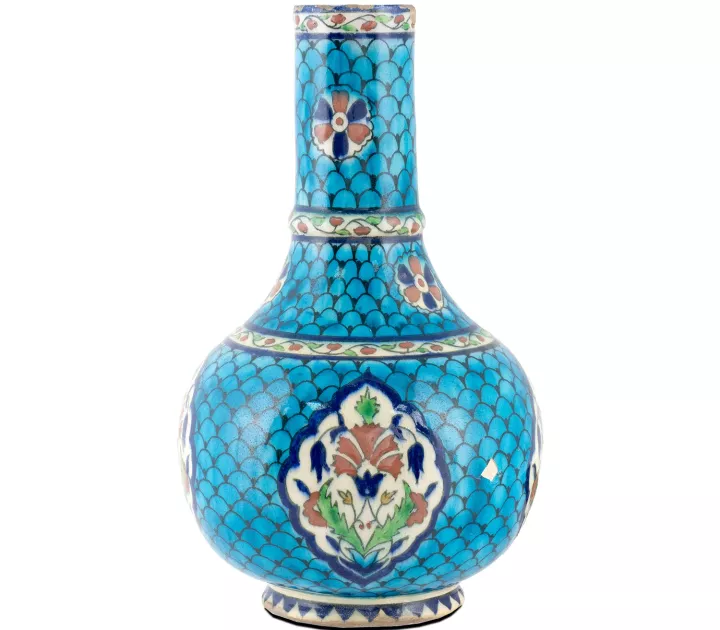 Κομψή φιάλη νερού από την Κιουτάχεια, χαρακτηριστικό δείγμα της οθωμανικής κεραμικής παραγωγής των ύστερων χρόνων (τέλος 19ου - αρχές 20ού αιώνα), όπου η διακοσμητική πληθωρικότητα συνδυάζεται με την καθημερινή χρήση (λαχνός 216, τιμή εκτίμησης: € 700 - 900). Στο σώμα αναπτύσσεται γραπτός φολιδωτός διάκοσμος σε έντονο τιρκουάζ, οργανωμένος γύρω από ρομβοειδή μετάλλια με γαρύφαλλα – μοτίβο αγαπητό στην κεραμική της περιοχής, φορτισμένο με συμβολισμούς ευφορίας. Ο λαιμός κοσμείται με περιμετρικές άνθινες ταινίες και μικρές κυκλικές ροζέτες, που λειτουργούν ως ήπια μετάβαση από τον όγκο του σώματος στην επιμήκη κατακόρυφη ανάπτυξη της μορφής.