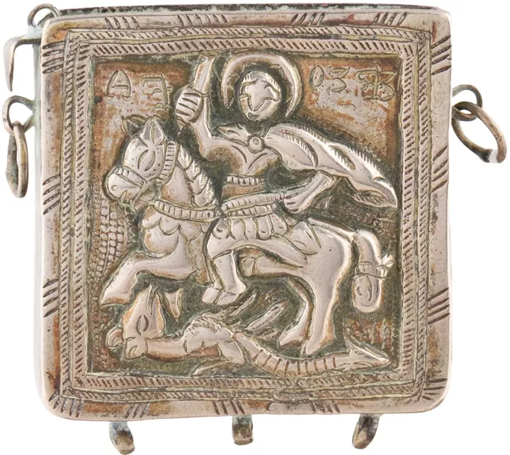 Ασημένιο φυλακτό με πλούσιο χυτό, σκαλιστό και εγχάρακτο διάκοσμο, χαρακτηριστικό της λαϊκής μεταλλοτεχνίας του 19ου αιώνα. Στην κύρια όψη δεσπόζει η παράσταση του δρακοκτόνου, έφιππου Αγίου Γεωργίου, αποδοσμένη με έντονη πλαστικότητα και αφηγηματική σαφήνεια: το άλογο σε κίνηση, το υψωμένο δόρυ και ο δράκος κάτω από τα οπλά συνθέτουν μια εικόνα νίκης του καλού απέναντι στο κακό.
