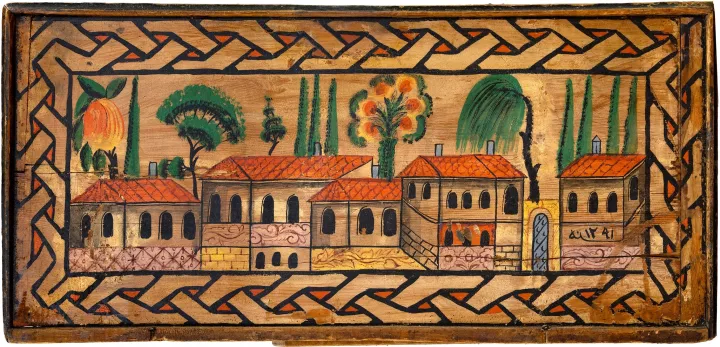 Ξύλινο καπάκι κασέλας με ζωγραφική διακόσμηση στο εσωτερικό, σπάνιο τεκμήριο λαϊκής ζωγραφικής από τη Μικρά Ασία του ύστερου 19ου αιώνα. Η παράσταση αναπτύσσεται ως πανοραμική όψη πυκνού οικιστικού συνόλου: κεραμοσκεπή κτίρια σε συνεχή διάταξη, με επαναλαμβανόμενα ανοίγματα και ρυθμική αρχιτεκτονική, πλαισιώνονται από πανύψηλα δέντρα που υψώνονται σαν φυσικό φράγμα πίσω από τα σπίτια.