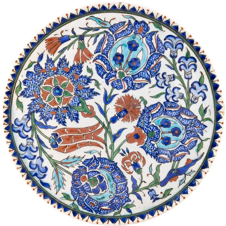 Η επιλογή της στήλης είναι ένα κεραμικό πιάτο από την Κιουτάχεια, με πυκνό γραπτό άνθινο διάκοσμο που καλύπτει ολόκληρη την επιφάνεια και αναπτύσσεται με ρυθμό και ισορροπία. Κυρίαρχα τα μοτίβα hatayi, πλαισιωμένα από τουλίπες, υάκινθους, γαρύφαλλα και παιώνιες, συνθέτουν ένα ζωηρό φυτικό σύμπαν που παραπέμπει στην οθωμανική διακοσμητική παράδοση, όπως αυτή διαμορφώνεται στα εργαστήρια της Κιουτάχειας στα τέλη του 19ου αιώνα.