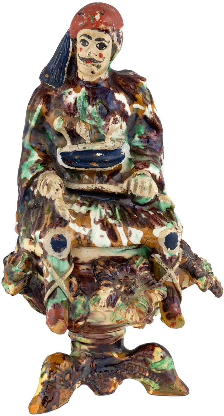 Χαρακτηριστικό γλυκοδοχείο από το Τσανάκκαλε, διαμορφωμένο σε τρισδιάστατη ανθρώπινη μορφή (λαχνός 222, τιμή εκτίμησης: € 1.000 - 1.500). Η μορφή του φουστανελοφόρου, καθισμένου σε χαμηλή βάση, αποδίδεται με πλαστικότητα, μετατρέποντας το χρηστικό σκεύος σε μικρό γλυπτό.
