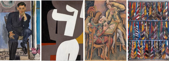 Από αριστερά: «Νέος σκεπτόμενος» (1938) του Γ. Τσαρούχη (εκτίμηση €60.000-80.000, τελική τιμή €139.884), «Ερωτικό» του Γ. Μόραλη (εκτίμηση €20.000-30.000 - τελική τιμή €114.676), «Οι χαρτοπαίχτες» του Παύλου Σάμιου (εκτίμηση €4.000-6.000 - τελική τιμή €8.354) και «Γραβάτες» του Παύλου (με αρχ. τιμή 60.000 ευρώ και διάσταση 205x164 εκ., δεν άλλαξαν χέρια).