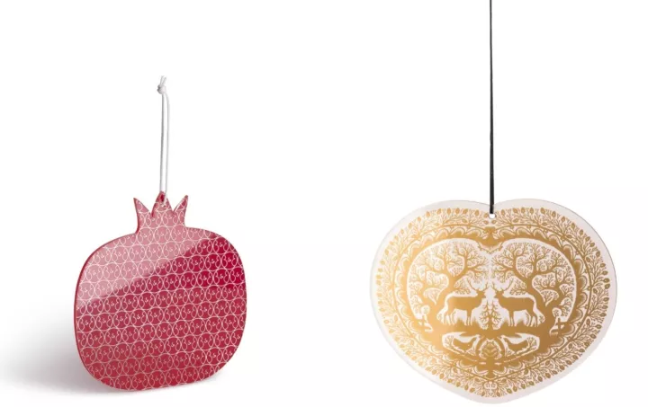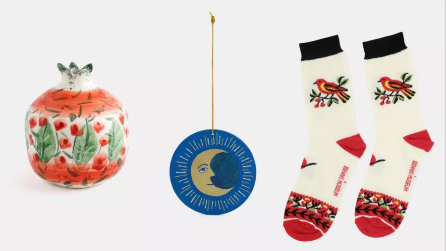 Διαχρονικής αξίας το κεραμικό ρόδι, εν προκειμένω ζωγραφισμένο στο χέρι με την υπογραφή της Ελένης Κανελλοπούλου (στα 60 ευρώ). Η ματιά μας εστιάζει, επίσης, σε χειροποίητο στολίδι από χαρτοπολτό που αποτελεί δημιουργία της Σοφίας Δαϊσπύρου (στα 16 ευρώ), καθώς και σε βαμβακερές κάλτσες (στα 15 ευρώ) εμπνευσμένες από ένα μάλλινο ζευγάρι με πολύχρωμα άνθινα σχέδια από τη Χαλκιδική, μέρος της Συλλογής Νεοελληνικής Τέχνης του Μουσείου Μπενάκη.