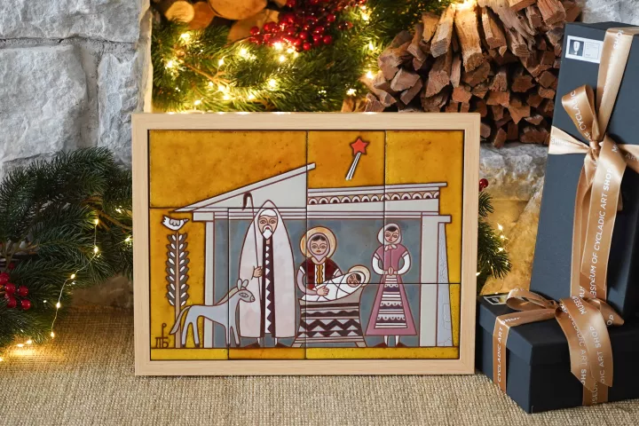 Aπεικόνιση της παράστασης γέννησης του Χριστού σε χειροποίητο κεραμικό πλακάκι με κορνίζα. Φωτ.: Γιώργος Λαμπρόπουλος © Μουσείο Κυκλαδικής Τέχνης
