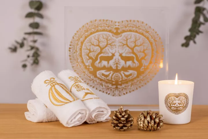 Η ματιά αναζητεί την καλαισθησία, και αυτό συμβαίνει και στο εν λόγω πωλητήριο. Καθένα από τα υπόλοιπα εορταστικά αντικείμενα είναι ξεχωριστό, δυσκολεύοντας την επιλογή του επισκέπτη, κυρίως σχετικά με τα στολίδια του δέντρου. Ανάμεσα στις επιλογές, εκείνο από plexiglass το οποίο αναπαριστά δύο ταράνδους στο μέσον του δάσους, κάτω από δύο δέντρα – όπως η συνάντηση των κόσμων δύο πλασμάτων όταν γνωρίζονται. Το συγκεκριμένο έχει σχήμα καρδιάς και έχει χρυσή εκτύπωση.