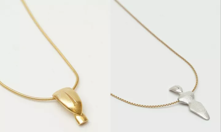Σε παρόμοιο μήκος κύματος το γούρι με Κυκλαδικό ειδώλιο του τύπου «Με διπλωμένα χέρια», επίχρυσο κρεμαστό (στα 60 ευρώ). Τι παριστάνουν αυτά τα ειδώλια; Γυναικείες μορφές οι οποίες στέκουν γυμνές με τα χέρια διπλωμένα στο στήθος – η αφηρημένη μορφή τους ίσως να αποτελούσε ιδεατή απόδοση μιας «Μητέρας Θεάς», σύμβολο γονιμότητας και αναγέννησης.