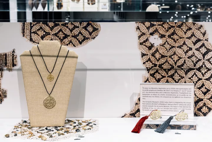 Κατέχει τα πρωτεία στη χώρα αναφορικά με τη μεγαλύτερη επισκεψιμότητα σε μουσείο, τα αντικείμενα που διατίθενται στο πωλητήριό του είναι μοναδικά, όμως οι εορταστικές ημέρες που διανύουμε στρέφουν την προσοχή μας στις αντίστοιχες προτάσεις δώρων, κυρίως στα γούρια. Φέτος, είναι εμπνευσμένα από τα μοτίβα ψηφιδωτού δαπέδου (Μ 2567) του Κτιρίου Ζ΄ του 6ου αιώνα μ.Χ., που εκτείνεται κάτω από το Μουσείο Ακρόπολης – πρόκειται για ψηφιδωτά τα οποία κοσμούσαν τα κτίρια του 6ου αιώνα μ.Χ., αντανακλούσαν με τα μοτίβα και την ποιότητά τους τον πλούτο, την ευημερία και την αφθονία των ιδιοκτητών τους.