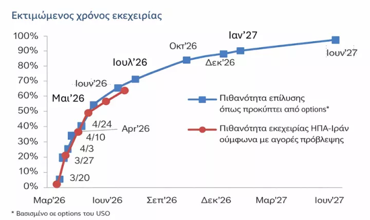 Ανάλογα με την έκβαση, οι αγορές δεν θα αντιδράσουν με τον ίδιο τρόπο. Με βάση τις τρέχουσες προσδοκίες, ο Μάιος αρχίζει να συγκεντρώνει τις περισσότερες πιθανότητες ως σημείο επίλυσης της κρίσης. Καθώς πλησιάζουμε προς τον Νοέμβριο, οπότε και είναι προγραμματισμένες οι ενδιάμεσες εκλογές στις Ηνωμένες Πολιτείες, η πιθανότητα αυτή αυξάνεται σταδιακά και προσεγγίζει το 80%. Η προσδοκία αυτή ενδέχεται να αποτυπωθεί και στις χρηματιστηριακές αγορές, ακόμη και αν στο πεδίο των εξελίξεων δεν υπάρχουν ακόμη σαφείς ενδείξεις αποκλιμάκωσης.