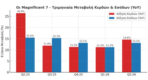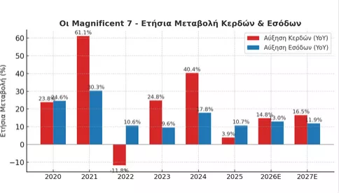 Για το τρίτο τρίμηνο του 2025, οι συγκλίνουσες εκτιμήσεις της αγοράς αναμένουν ότι τα συνολικά κέρδη των Magnificent 7 θα αυξηθούν κατά +11,9% σε ετήσια βάση, ενώ τα έσοδα θα ενισχυθούν κατά +15,3%. Οι εκτιμήσεις αυτές περιλαμβάνουν τα πραγματικά στοιχεία της Tesla και τις προβλέψεις για τις υπόλοιπες έξι εταιρείες.