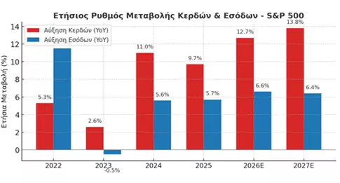 Οι τρέχουσες εκτιμήσεις δείχνουν ότι τα συνολικά κέρδη ανά μετοχή του δείκτη S&P 500 θα διαμορφωθούν στα $257,83 για το 2025 και στα $290,48 για το 2026, αντανακλώντας μια σταθερή ανοδική πορεία κερδοφορίας για τις μεγάλες αμερικανικές επιχειρήσεις.