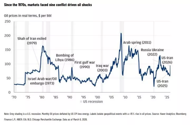1. Πληθωρισμός. Το πετρέλαιο αυξάνει το κόστος παραγωγής και μεταφοράς σχεδόν κάθε αγαθού. Αυτό που ανησυχεί τις κυβερνήσεις και τις κεντρικές τράπεζες σήμερα, δεν είναι μόνο η τιμή στην αντλία, αλλά οι «δευτερογενείς επιπτώσεις» που θα μπορούσαν να μονιμοποιήσουν τον ήδη «ανθεκτικό» πληθωρισμό σε υψηλά επίπεδα. Και όπως βλέπουμε και στο ακόλουθο γράφημα από το 1970 μέχρι σήμερα, της Haver Analytics, της Bloomberg Finance και του Chicago Merchantile Exchange, κάθε έκρηξη στις τιμές του πετρελαίου είχε οδηγήσει στην εμφάνιση πληθωρισμού.