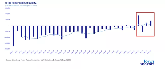 Η συντηρητική στάση της Ομοσπονδιακής Τράπεζας των ΗΠΑ (Fed) ως προς τα επιτόκια περιπλέκει περαιτέρω την εικόνα, αν και πολλοί επενδυτές εκτιμούν ότι ο επερχόμενος πρόεδρος της Fed, Kevin Warsh, ενδέχεται να προχωρήσει σε μειώσεις επιτοκίων παρά τις πληθωριστικές πιέσεις. Για περισσότερο από μια δεκαετία, οι επαγγελματίες επενδυτές αποδίδουν σχεδόν «δογματικά» την άνοδο των αγορών στη νομισματική πολιτική της Fed. Πράγματι, ο ισολογισμός της έχει διευρυνθεί εκ νέου τους τελευταίους μήνες, παρά τη συγκρατημένη στάση στα επιτόκια.