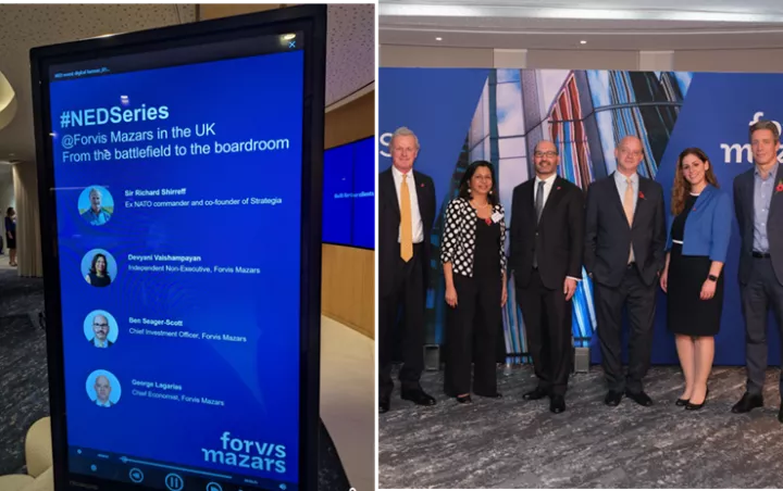 Από τα αριστερά: Sir Richard Shireff - former Deputy Supreme Allied Commander Europe, Devyani P Vaishampayan - Independent Board Director, Ben Seager Scott – Forvis Mazars UK Chief Investment Officer, Γιώργος Λαγαρίας – Forvis Mazars Chief Economist, Deniz Nadiri – Forvis Mazars London Office Managing Partner and James Gilbey, Forvis Mazars UK CEO.