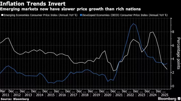Για δύο συνεχόμενα τρίμηνα, οι τιμές καταναλωτή στις αναδυόμενες αγορές αυξάνονται με χαμηλότερο ρυθμό σε σχέση με τις ανεπτυγμένες οικονομίες, σύμφωνα με στοιχεία του Bloomberg - ένα φαινόμενο που είχε να εμφανιστεί εδώ και περίπου 35 χρόνια, εκτός από τη σύντομη περίοδο της πανδημίας. Η ανατροπή αυτή ενδέχεται να αποδειχθεί ιδιαίτερα ευνοϊκή για την αγορά ομολόγων.