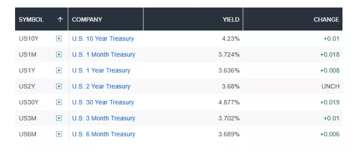 Η απόδοση του 10ετούς αμερικανικού ομολόγου αναφοράς ενισχύθηκε κατά περισσότερο από 2 μονάδες βάσης, στο 4,239%, ενώ η απόδοση του 30ετούς κρατικού ομολόγου αυξήθηκε σχεδόν κατά 3 μονάδες βάσης, στο 4,887%. Η απόδοση του 2ετούς αμερικανικού ομολόγου παρέμεινε σχεδόν αμετάβλητη, γύρω στο 3,686%. Μία μονάδα βάσης ισοδυναμεί με 0,01%, ενώ οι αποδόσεις και οι τιμές κινούνται αντίστροφα.