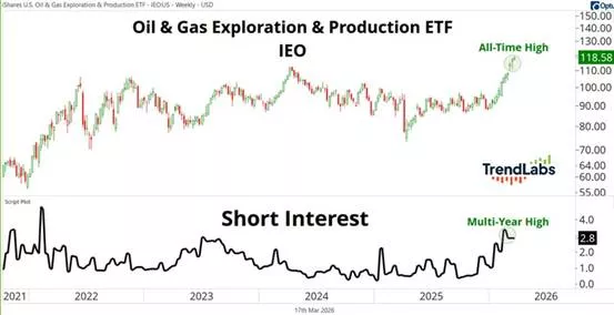 Έτσι στο «US Oil & Gas Exploration & Production ETF», που διαπραγματεύεται ως $IEO, έχουν ανοίξει θέσεις short που αντιστοιχούν στο 2,8% του χαρτοφυλακίου, το υψηλότερο ποσοστό από το 2022. Παράλληλα οι θέσεις short στο «United States Oil ETF», που διαπραγματεύεται ως $USO, έχουν αυξηθεί κατά 50% από την έναρξη του πολέμου μέχρι σήμερα.