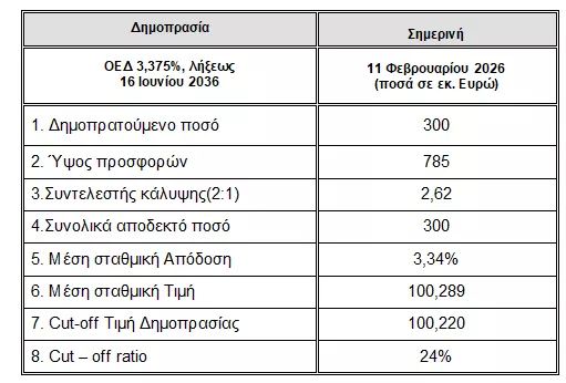Όπως σημειώνεται στη σχετική ανακοίνωση, «σήμερα διενεργήθηκε επανέκδοση μέσω δημοπρασίας Ελληνικών τίτλων 3,375%, λήξεως 16 Ιουνίου 2036, ύψους 300 εκατομμυρίων Ευρώ. Η δημοπρασία πραγματοποιήθηκε μέσω των Βασικών Διαπραγματευτών Αγοράς (Primary Dealers). Οι συνολικές προσφορές ανήλθαν σε 785 εκατ. Ευρώ και η ημερομηνία διακανονισμού είναι η Τετάρτη 18 Φεβρουαρίου 2026.
