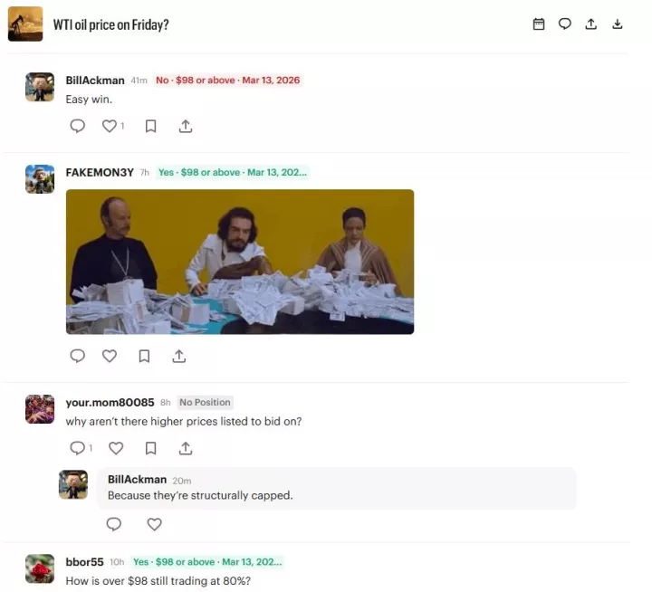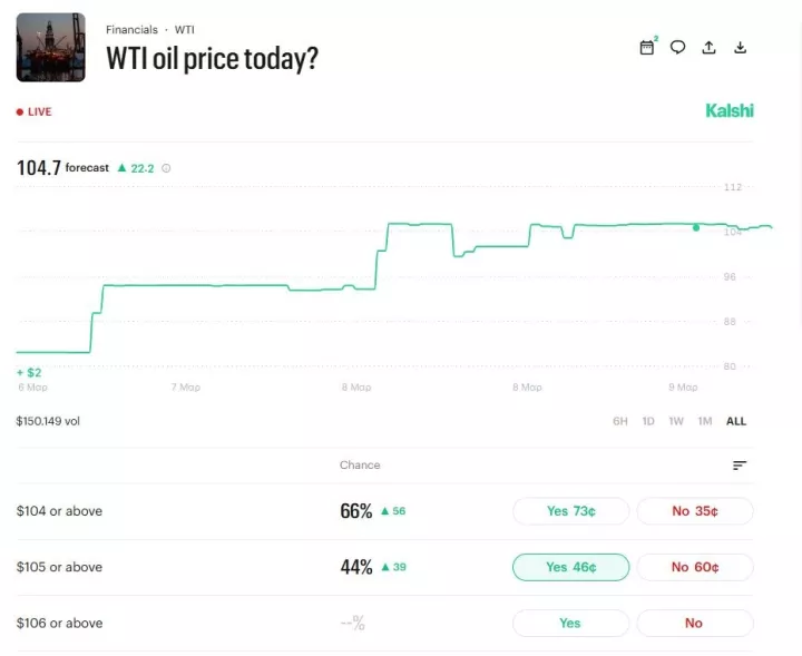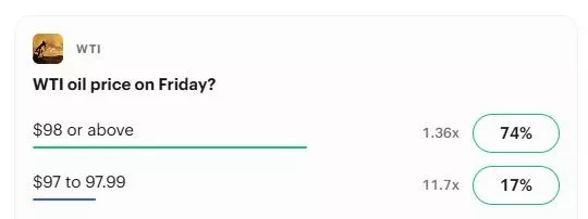 Σήμερα οι στοιχηματικοί παίκτες ποντάρουν πάνω στις εξελίξεις του πολέμου στο Ιράν, στοιχηματίζοντας πάνω στη τιμή που θα κλείσει σήμερα το πετρέλαιο WTI, όπως βλέπουμε ακολούθως: