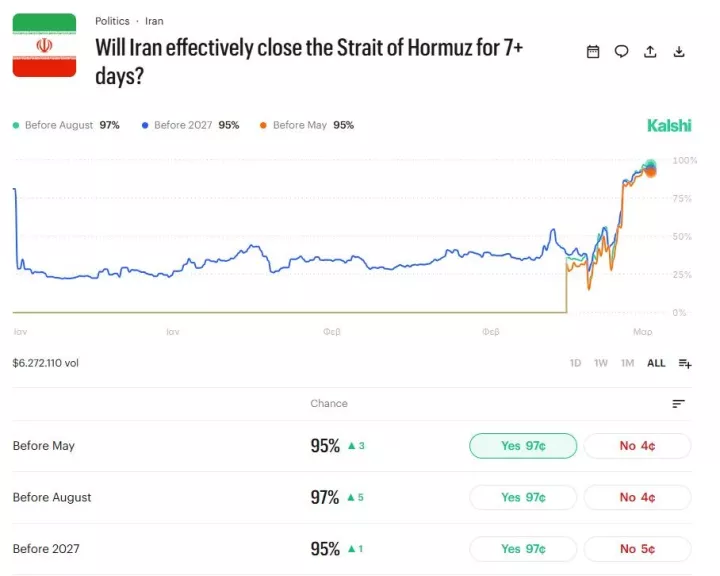 Τα πονταρίσματα ξεφεύγουν από τα στενά πλαίσια των χρηματιστηριακών δεικτών και των τιμών του πετρελαίου και μπαίνουν στον πυρήνα του πολέμου. Έτσι οι συμμετέχοντες ποντάρουν στην πιθανότητα να κλείσουν οι Ιρανοί τα Στενά του Ορμούζ για χρονικό διάστημα μεγαλύτερο των 7 ημερών, πριν τον Μάιο, πριν τον Αύγουστο ή πριν το τέλος του 2027, όπως βλέπουμε στο ακόλουθο γραφικό:
