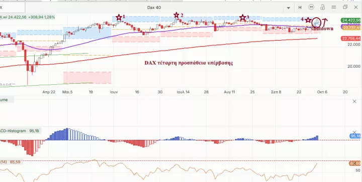 Η βιασύνη να προλάβουμε την πτώση οδηγεί σε περισσότερες ακραίες διακυμάνσεις τους δείκτες. Ενδεικτικό παράδειγμα αποτελεί η προχθεσινή κίνηση του δείκτη DAX όπου μετά από τετράμηνη συσσώρευση γύρω από τον πενηντάρη (κινητός μέσος) με αφορμή το νέο του «Shutdown» τον ξεπέρασε για πρώτη φορά και πέταξε έξω όλο το short, που περίμενε ότι το νέο θα λειτουργήσει ως ευκαιρία πτωτικής κίνησης.