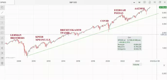 Στο κάτωθι διάγραμμα παρακολουθούμε την απόδοση του S&P 500 από την κρίση του 2008. Χωρίς να αναφέρω τεχνικά σημεία παρά μονό τα γεγονότα και την ανοδική γραμμή τάσης, διακρίνουμε τη διαφορά. Οι κρίσεις μετά το 2008 άλλαξαν τον τρόπο παιχνιδιού.