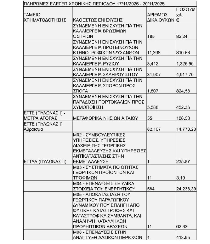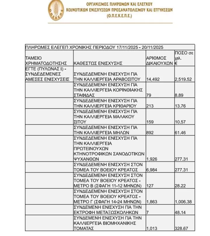 Στην πληρωμή και νέων συμπληρωματικών συνδεδεμένων ενισχύσεων (αιτήσεις του 2024) σε 82.870 αγρότες προχώρησε ο Οργανισμός Πληρωμών και Ελέγχου Κοινοτικών Ενισχύσεων Προσανατολισμού και Εγγυήσεων (ΟΠΕΚΕΠΕ), καταβάλλοντας συνολικά 46 εκατομμύρια ευρώ στους τραπεζικούς λογαριασμούς των δικαιούχων.
