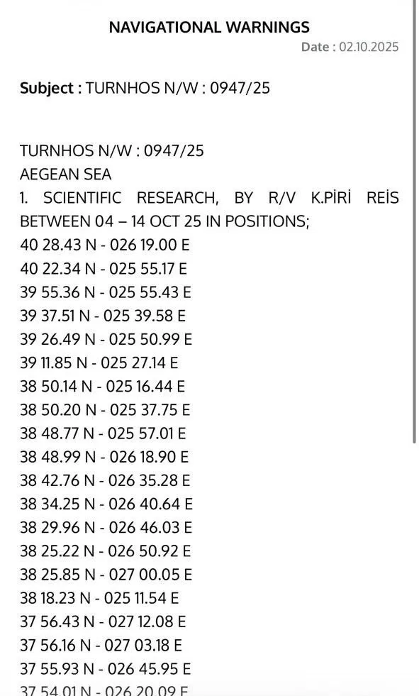 Σύμφωνα με τη σχετική ανακοίνωση της Υδρογραφικής Υπηρεσίας της Σμύρνης, οι έρευνες θα πραγματοποιηθούν κατά το χρονικό διάστημα από τις 4 έως τις 14 Οκτωβρίου.