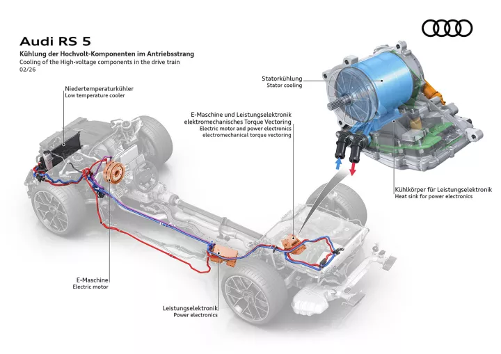 Στον θερμικό τομέα, το RS 5 χρησιμοποιεί τον V6 2.9 TFSI biturbo, ο οποίος αποδίδει 375 kW (510 PS) και 600 Nm ροπής. Ο κινητήρας λειτουργεί με τροποποιημένο κύκλο Miller, ενώ διαθέτει δύο turbo μεταβλητής γεωμετρίας.Το ηλεκτρικό μέρος αποτελείται από ηλεκτροκινητήρα ισχύος 130 kW (177 PS) και ροπής 460 Nm, ενσωματωμένο στο αυτόματο κιβώτιο tiptronic 8 σχέσεων με μετατροπέα ροπής. Η συνδυαστική λειτουργία των δύο μονάδων οδηγεί στη συνολική απόδοση των 639 PS.