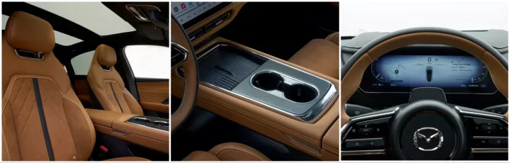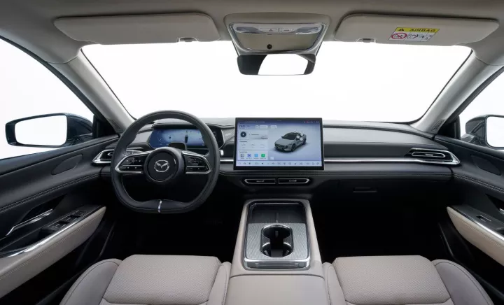 Στο εσωτερικό δεσπόζει η πολύ μεγάλη κεντρική οθόνη των 14 ιντσών, που πλαισιώνεται από τον μικρό ψηφιακό πίνακα οργάνων και ένα μεγάλο head up display, που προβάλει κρίσιμες πληροφορίες μέσα στο παρμπρίζ, στο ύψος του οπτικού πεδίου του οδηγού. Με ήκος 4,921m και το μεταξόνιο που αγγίζει τα 2.900mm, η Mazda κάνει λόγο για πλουσιοπάροχους χώρους, και πόρτ-μπαγκάζ 336 λίτρων το οποίο όμως μπορεί να φθάσει μέχρι και τα 1.074 λίτρα με την αναδίπλωση των πίσω καθισμάτων. Είναι δε σημαντικό ότι υπάρχει και ένας ακόμα μεγάλος χώρος - “frunk” - κάτω από το εμπρός καπό, με χωρητικότητα 74 λίτρα.