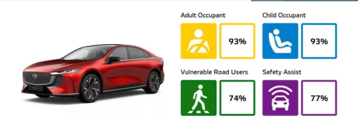 Aυτό το αυτοκίνητο λοιπόν, στα πρόσφατα crash test του οργανισμού Euro NCAP βαθμολογήθηκε με την ανώτερη διάκριση 5 αστέρων, εξασφαλίζοντας τα μέγιστα επίπεδα προστασίας. Μάλιστα, Στις δύο κατηγορίες προστασίας ενηλίκων και παιδιών, το νέο αμιγώς ηλεκτρικό μοντέλο της Mazda σημείωσε εξαιρετική βαθμολογία 93%. Το Mazda 6e βαθμολογήθηκε επίσης με 74% για την προστασία των ευάλωτων χρηστών του οδικού δικτύου και με 77% για τα συστήματα υποβοήθησης ασφαλείας.