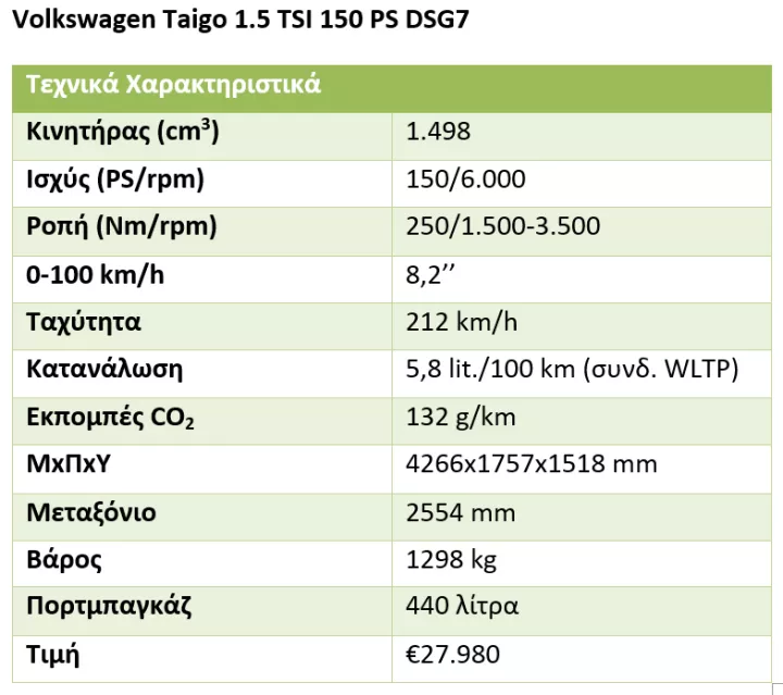 Έχοντας τώρα υπόψη μας ότι πριν από ένα χρόνο είχαμε γράψει πολύ καλά λόγια και για το VW Taigo των 116 ίππων γεννάται το ερώτημα τι τελικά είναι αυτό που προσφέρουν οι 150 ίπποι και τα 250 Nm ροπής. Μήπως είναι υπερβολή; Η απάντηση είναι ότι αν θα μπορούσε να πει κανείς ότι οι επιπλέον 34 PS δεν είναι απαραίτητοι, ωστόσο κάθε φορά που βρίσκεσαι στην ανάγκη να προσπεράσεις καταλαβαίνεις τελικά τι έχεις κερδίσει εάν οδηγείς το «χιλιοπεντακοσάρι» αυτοκίνητο αντί για το «χιλιάρι». Συνδυασμένο αποκλειστικά με το γνωστό αυτόματο κιβώτιο διπλού συμπλέκτη DSG 7 σχέσεων, το μοτέρ έχει αρκετή ροπή και το κιβώτιο κάνει άμεσο kickdown (αυτόματο κατέβασμα σχέσεων στη βύθιση του πεντάλ γκαζιού) για γρήγορες ρεπρίζ και ασφαλείς προσπεράσεις, ακόμη και με πλήρες φορτίο.