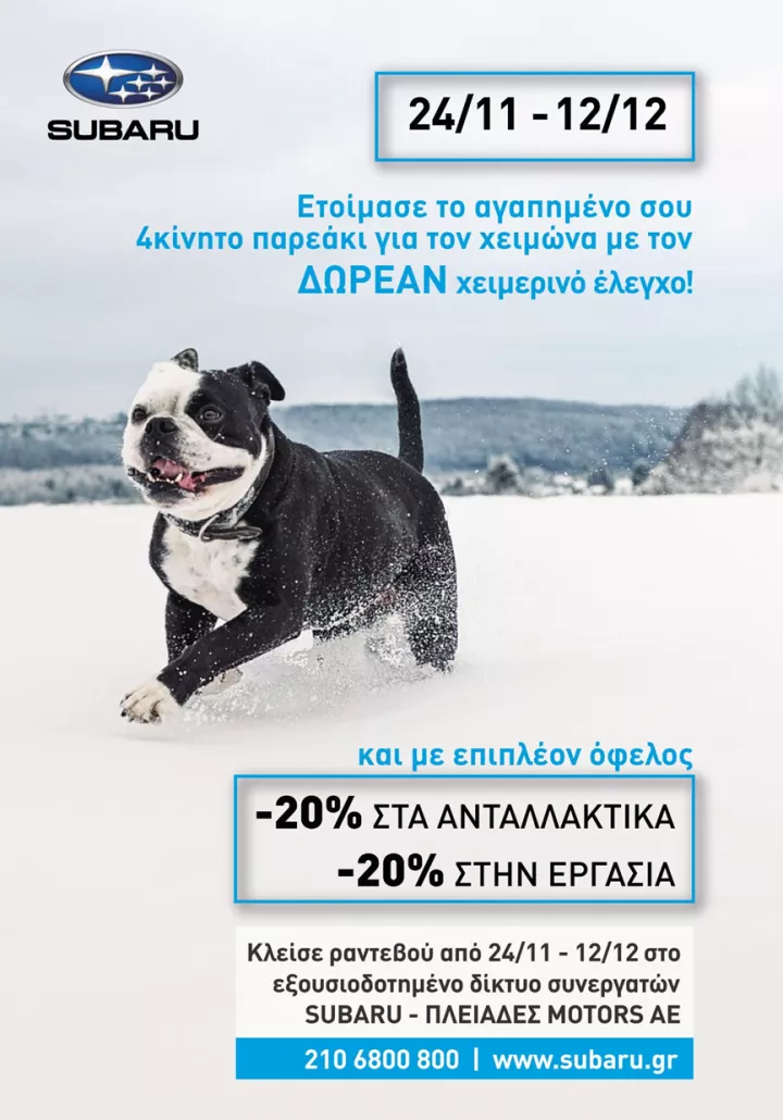 Δωρεάν έλεγχο του αυτοκινήτου τους μπορούν να πραγματοποιήσουν οι πελάτες της Subaru, στο εξουσιοδοτημένο δίκτυο της εταιρίας, για να είναι πανέτοιμοι να αντιμετωπίσουν τις δύσκολες χειμερινές καιρικές συνθήκες, αλλά και να επωφεληθούν από εκπτώσεις που αφορούν τα ανταλλακτικά και την εργασία, σε περίπτωση που αυτά χρειαστούν.