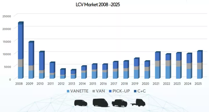 Η ελληνική αγορά ελαφρών επαγγελματικών οχημάτων / Light Commercial Vehicles [LCVs], έως 3,5 τόνους μικτό βάρος, έκλεισε το 2025 με 11.127 ταξινομήσεις, σημειώνοντας αύξηση 12,7% σε σχέση με το 2024. Η επίδοση αυτή επιβεβαιώνει τη σταδιακή σταθεροποίηση της αγοράς τα τελευταία χρόνια, χωρίς όμως να πλησιάζει τα επίπεδα πριν από την οικονομική κρίση. Πλέον, το «ταβάνι» της αγοράς φαίνεται να διαμορφώνεται γύρω στις 10.000–11.000 μονάδες ετησίως, με την ανάπτυξη να εξαρτάται σε μεγάλο βαθμό από τις εταιρικές ανανεώσεις στόλων.