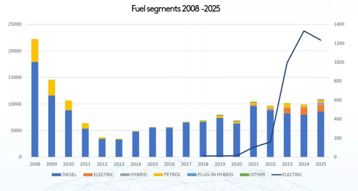 Το μίγμα καυσίμου διαφοροποιείται ανά κατηγορία. Στα μικρά vans η ηλεκτροκίνηση έχει ήδη αποκτήσει διψήφιο ποσοστό, προσεγγίζοντας το 20%, καθώς το αστικό προφίλ χρήσης διευκολύνει τη φόρτιση και τη διαχείριση αυτονομίας. Στα medium vans τα ηλεκτρικά κινούνται κοντά στο 17%, ενώ στα large vans το diesel εξακολουθεί να κυριαρχεί με σαφή διαφορά, καθώς η απαίτηση για αυτονομία υπό φορτίο και συνεχόμενη χρήση δεν ευνοεί ακόμη τη μαζική μετάβαση σε BEV.
