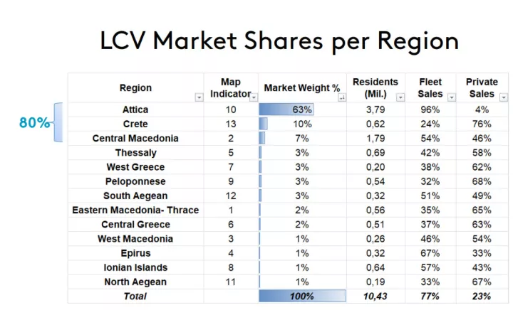 Η δομή της ζήτησης παραμένει σαφώς προσανατολισμένη στο fleet, που αντιστοιχεί σε περίπου 77% των ταξινομήσεων. Οι μεγάλες εταιρίες διανομών, τα logistics και τα προγράμματα μακροχρόνιας μίσθωσης καθορίζουν τον όγκο. Παράλληλα, η αγορά είναι γεωγραφικά συγκεντρωμένη: Αττική, Κεντρική Μακεδονία και Κρήτη συγκεντρώνουν το 80% των ταξινομήσεων, με την Αττική μόνη της να απορροφά σχεδόν τα δύο τρίτα.