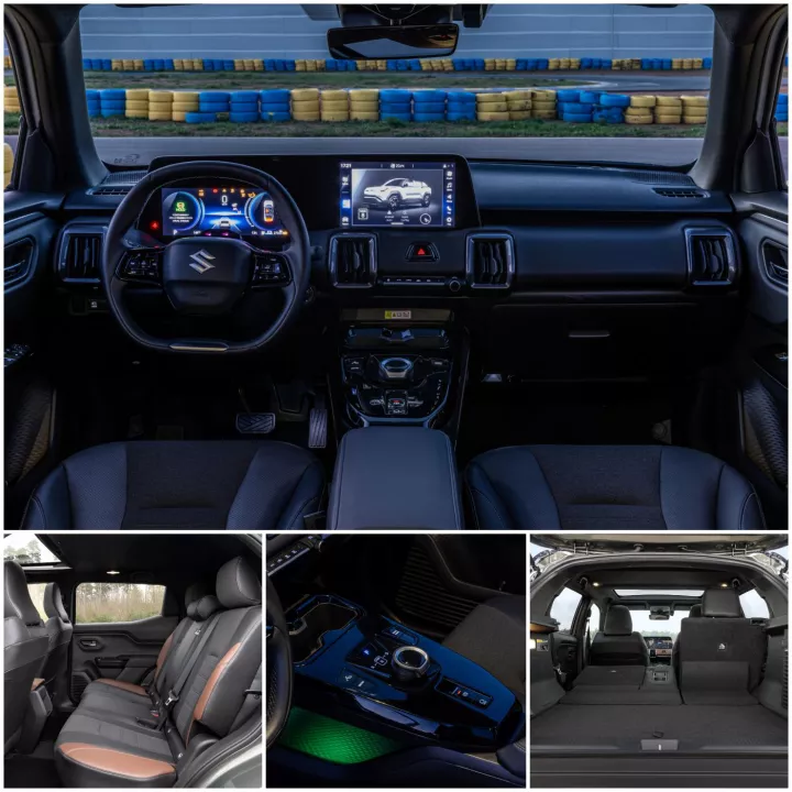 Το εσωτερικό του νέου e Vitara δείχνει πολύ προσεγμένο σε ποιότητα, ενώ έχει και μοντέρνα σχεδίαση. Για πρώτη φορά σε μοντέλο της Suzuki τοποθετείται ένα ενιαίο πάνελ όπου ενσωματώνονται ο ψηφιακός πίνακας οργάνων των 10,25 ιντσών και η οθόνη του infotainment των 10,1 ιντσών. Οι χώροι των πίσω επιβατών είναι αισθητά περισσότεροι από του Vitara, λόγω του μακρύτερου μεταξονίου, ενώ το κάθισμα είναι συρόμενο σε μια διαδρομή 160mm. Το πορτ μπαγκάζ έχει χωρητικότητα 310 λίτρων, ωστόσο επεκτείνεται αν τραβηχτούν μπροστά τα πίσω διαιρούμενα (αναλογία 40/20/40) καθίσματα.