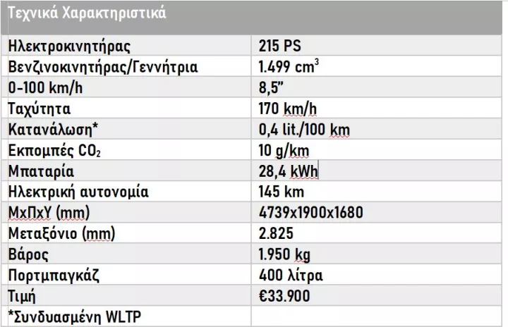 Η μπαταρία με τη σειρά της έχει ενεργειακή χωρητικότητα 28,4 kWh και μπορεί να φορτιστεί σε παροχή εναλλασσόμενου (AC) ή συνεχούς (DC) ρεύματος με ισχύ έως 65 kW, κάτι που σημαίνει ανάκτηση του 50% της ενέργειας σε μόλις 18’. Εκτός από τα 3 προγράμματα λειτουργίας του αυτοκινήτου (Άνεση, Σπορ και Εξατομικευμένο) υπάρχουν 4 λειτουργίες ενέργειας: α) EV+ [μεγιστοποιεί τη χρήση της μπαταρίας επιτρέποντας στη γεννήτρια να ξεκινά μόνο κάτω από το 10%, ιδανικό για αύξηση των χιλιομέτρων που διανύονται σε πλήρως ηλεκτρική λειτουργία], β) ΕV [δίνει προτεραιότητα στην ηλεκτρική οδήγηση για τις καθημερινές μετακινήσεις, με τη γεννήτρια να ξεκινά μόνο όταν η μπαταρία πέσει κάτω από το 25%], γ) Καύσιμο [διατηρεί τo επίπεδο φόρτισης της μπαταρίας σε υψηλό επίπεδο χρησιμοποιώντας τη γεννήτρια, ιδανικό για μακρινά ταξίδια με περιορισμένες δυνατότητες φόρτισης] και δ) Ισχύς+ [διατηρεί τη γεννήτρια σε συνεχή λειτουργία για να εξασφαλίζει ισχυρή απόδοση σε απαιτητικές συνθήκες ή σε συνθήκες χαμηλής μπαταρίας].