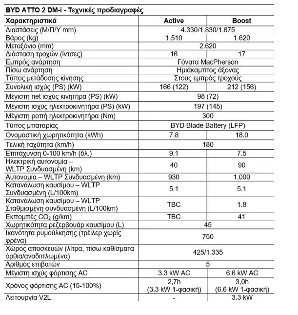Το νέο AΤΤΟ 2 DM-i διατίθεται σε δύο εκδόσεις, με την Active των 166 ίππων να διαθέτει μία μικρή μπαταρία χωρητικότητας 7,8 kWh. Σε αυτή την περίπτωση, το ΑΤΤΟ 2 DM-i μπορεί να κινηθεί αμιγώς ηλεκτρικά για 40 km σε μικτές συνθήκες, ενώ η συνδυαστική αυτονομία φτάνει στα 930 km.