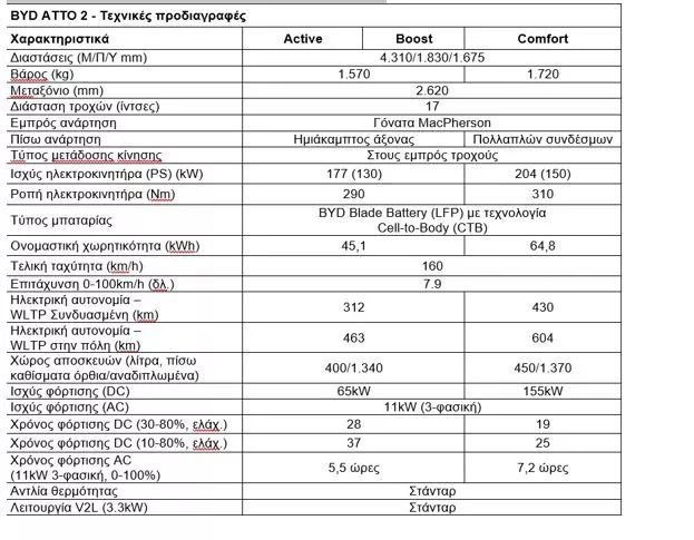 H νέα έκδοση Comfort του BYD ATTO 2, που στην ελληνική αγορά αναμένεται το προσεχές χρονικό διάστημα, αξιοποιεί τις δυνατότητες της πλατφόρμας e-Platform 3.0 και χαρακτηρίζεται από μια μεγαλύτερη LFP μπαταρία 64,8 kWh - σχεδόν 20 kWh μεγαλύτερη από τις υπόλοιπες ηλεκτρικές εκδόσεις του compact ηλεκτρικού SUV της μάρκας. Ως αποτέλεσμα, το ATTO 2 Comfort υπόσχεται αυτονομία 430 km σε μικτές συνθήκες οδήγησης (πρότυπο WLTP), τιμή που ξεπερνάει τα 600 km στην πόλη. Η χημεία LFP εξασφαλίζει υψηλότερα επίπεδα ασφάλειας και ανθεκτικότητας σε σύγκριση με τις συμβατικές μπαταρίες ιόντων λιθίου, ενώ είναι επίσης 100% απαλλαγμένη από κοβάλτιο.