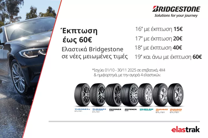 Για όλο τον Οκτώβριο και τον Νοέμβριο, η ΕΛΑΣΤΡΑΚ, επίσημος αντιπρόσωπος της Bridgestone στην Ελλάδα, προσφέρει τη μοναδική ευκαιρία για να εξοπλίσετε το όχημά σας με ελαστικά υψηλής ποιότητας, επωφελούμενοι από σημαντικές εκπτώσεις έως και 60 ευρώ!