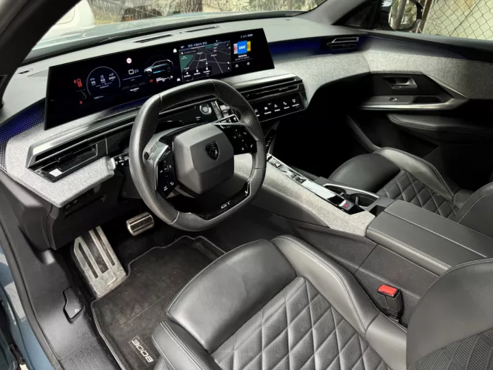 Η εικόνα του εντυπωσιακού ταμπλό είναι γνώριμη από το 3008. Το πανοραμικό i-Cockpit με το κυρτό πάνελ των 21 ιντσών, που ενσωματώνει τον ψηφιακό πίνακα οργάνων και την οθόνη του infotainment, είναι στάνταρ και κυριαρχεί οπτικά. Τα i-toggles (σσ. πλήκτρα αφής για εξατομικευμένη άμεση επιλογή των πιο συχνά χρησιμοποιουμένων λειτουργιών) στο κέντρο της κονσόλας προσθέτουν εργονομία σε έναν κατά τα άλλα έντονα ψηφιακό διάκοσμο, ενώ η θέση οδήγησης με το μικρό τιμόνι και το «αγκαλιασμένο» ταμπλό, που εξακολουθεί να αποτελεί σήμα κατατεθέν των σύγχρονων Peugeot, δίνει και εδώ το παρών.