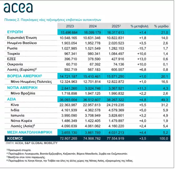 Η παγκόσμια αγορά αυτοκινήτου κινήθηκε ανοδικά το 2025, με αύξηση 3,5% και συνολικό όγκο 77,6 εκατ. οχημάτων. Ωστόσο, η ανάπτυξη αυτή δεν κατανέμεται ομοιόμορφα.