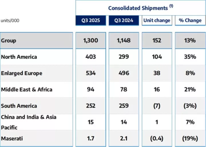 Για το τρίμηνο που ολοκληρώθηκε στις 30 Σεπτεμβρίου 2025, οι συνολικές αποστολές υπολογίζονται σε 1,3 εκατ. οχήματα, σημειώνοντας αύξηση 13% σε ετήσια βάση. Τη μεγαλύτερη ώθηση έδωσε η αγορά της Βόρειας Αμερικής, ενώ θετική πορεία κατέγραψαν και η διευρυμένη Ευρώπη καθώς και η περιοχή Μέσης Ανατολής & Αφρικής. Η ανάκαμψη της Stellantis στη Βόρεια Αμερική είναι εντυπωσιακή με 35%, όπως προκύπτει από τις 104.000 περισσότερες αποστολές σε σχέση με το περσινό τρίτο τρίμηνο.