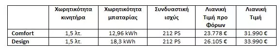 1. Η Comfort χρησιμοποιεί μπαταρία 12,96 kWh, προσφέροντας έως 62 χιλιόμετρα ηλεκτρικής αυτονομίας και συνολική αυτονομία 992 χλμ., με επιτάχυνση 0-100 km/h σε 7,7 δευτερόλεπτα.