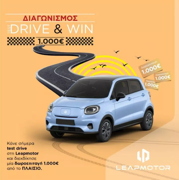Όσοι μέχρι τις 30 Νοεμβρίου πραγματοποιήσουν test-drive στα μοντέλα της Leapmotor έχουν πιθανότητα να κερδίσουν δωροεπιταγές 1.000 ευρώ μέσω του διαγωνισμού «Test Drive & Win», που πραγματοποιεί η ελληνική αντιπροσωπεία.