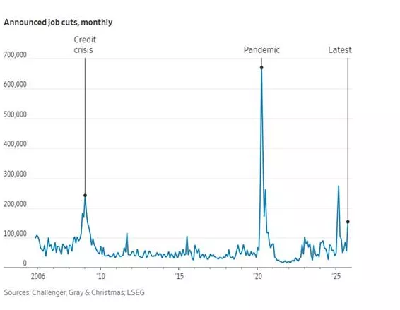 📈 Οι 153.000 περικοπές θέσεων εργασίας που ανακοίνωσαν οι αμερικανικές εταιρείες τον Οκτώβριο, συνιστούν αύξηση 175% σε ετήσια βάση — το υψηλότερο νούμερο για Οκτώβριο εδώ και δύο δεκαετίες. Είναι, επίσης, ο μεγαλύτερος αριθμός απολύσεων για οποιονδήποτε μήνα του τέταρτου τριμήνου από το μακρινό 2008.