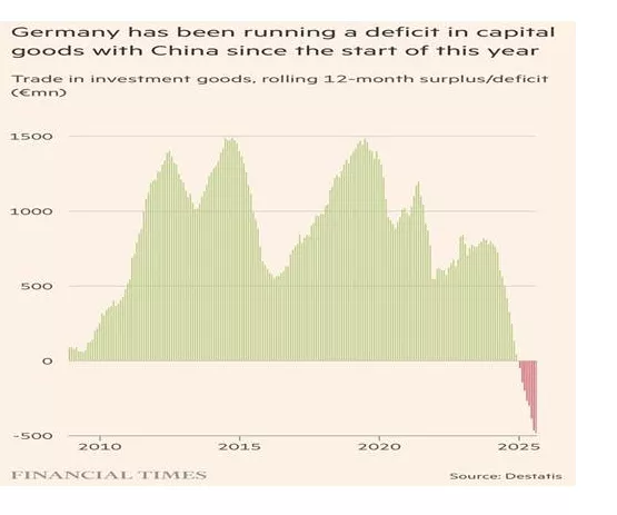 💼 Για πρώτη φορά από τότε που υπάρχουν συγκρίσιμα στοιχεία, η Γερμανία εμφανίζει έλλειμμα στο εμπόριο κεφαλαιουχικών αγαθών με την Κίνα. Σύμφωνα με τα στοιχεία της Destatis, το 12μηνο κυλιόμενο ισοζύγιο έχει βυθιστεί κάτω από το μηδέν, σηματοδοτώντας δομική ανατροπή σε έναν τομέα όπου η Γερμανία κυριαρχούσε επί δεκαετίες.