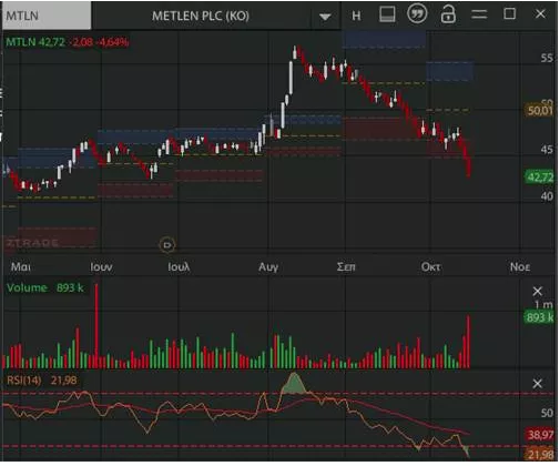 Η Μυτιληναίος έχει εισέλθει σε υπερβολική φάση πώλησης, με τα τεχνικά μεγέθη να δείχνουν εξάντληση της πτωτικής ορμής. Μια σταθεροποίηση πάνω από τα €41–42 θα μπορούσε να λειτουργήσει ως σημείο αναστροφής και ένα πιθανό βραχυπρόθεσμο ράλι προς τα €46–47.