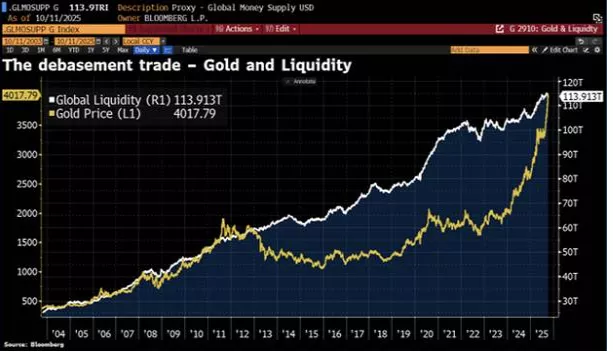 Το διάγραμμα δείχνει κάτι πολύ πιο βαθύ από μια απλή άνοδο της τιμής του χρυσού. Για πρώτη φορά μετά από δεκαετίες, ο χρυσός ανεβαίνει πολύ ταχύτερα από την αύξηση της παγκόσμιας ρευστότητας.